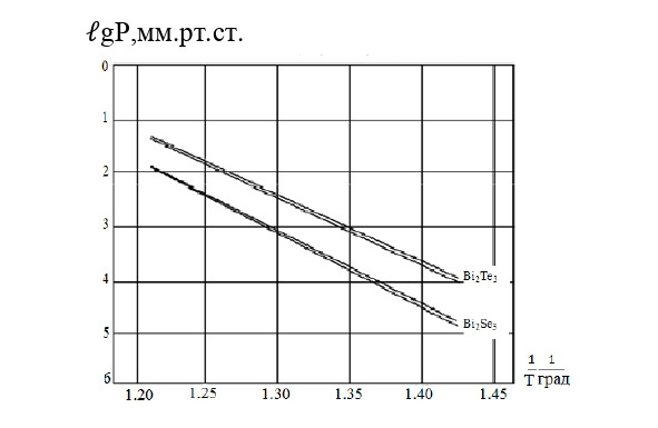 Графический зависимость lgP=f (1/T) для парциальных давлений теллурида висмута и селенида висмута с легирующей добавкой представлена на рис.1.