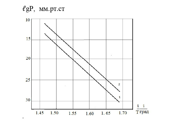 Рис.2. Давление насыщенного пара твёрдого теллура с легирующей добавкой в интервале температур 5930—6830К.1- для чистого материала [2]. 2- по нашим данным.
