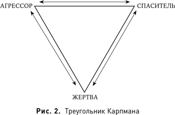 При создании несложных жанровых произведений, в которых характеры героев нередко подменяются их функциями, зачастую помогает картина распределения ролей, основанная на так называемом треугольнике Карпмана (рис. 2), придуманном для описания социального и психологического взаимодействия настоящих людей в обществе и трудовых коллективах. Например, герой упомянутого «Мальтийского сокола» знакомится с «жертвой» – беззащитной женщиной. «Жертве» угрожает «агрессор», и герой становится «спасителем». Однако беззащитная особа оказывается роковой женщиной и из «жертвы» превращается в «агрессора», а «спаситель» сам становится «жертвой» и вынужден искать в себе силы и возможности, чтобы победить.