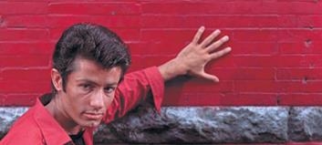 Бернардо (Джордж Чакирис) отвечает «ракетам» оглушающей ненавистью, которая читается не только во взгляде героя, но и в цветовом решении кадра – актер, одетый в ярко-красную рубашку, стоит на фоне кроваво-красной кирпичной стены (Рисунок 2).