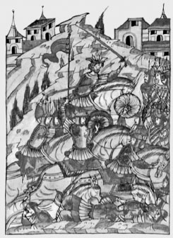 Барак-хан в битве с Куидатом. Миниатюра из Лицевого летописного свода. XVI век