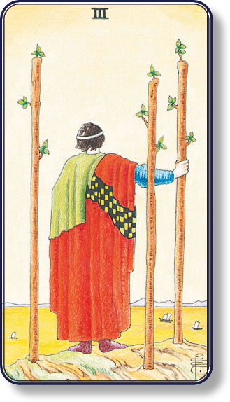 Как и во многих МА, в 3 Жезлов также присутствует расхождение описания с изображением. Уэйт делает указание на то, что «словно преуспевающий купеческий старейшина глядит на вас с намерением помочь», а мы видим в композиции карты лишь спину персонажа, и в этом очень трудно усмотреть желание помочь вопрошающему.