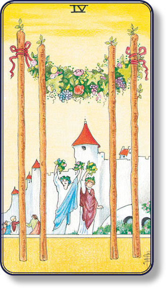 В трудных ситуациях может указывать на определение детей в детский дом после лишения матери родительских прав. Либо на усыновление (удочерение) детей из приюта. В данном случае значение Артура Уэйта «приют» приобретает свой истинный смысл. Кроме того, получить «приют» в квартире может как маленький бездомный котенок, так и родственники в ожидании строительства своей квартиры по долевому участию. Очень редко данный аркан может указывать на сами праздники или просто отдых. Поэтому 4 Жезлов не является однозначно положительным арканом.