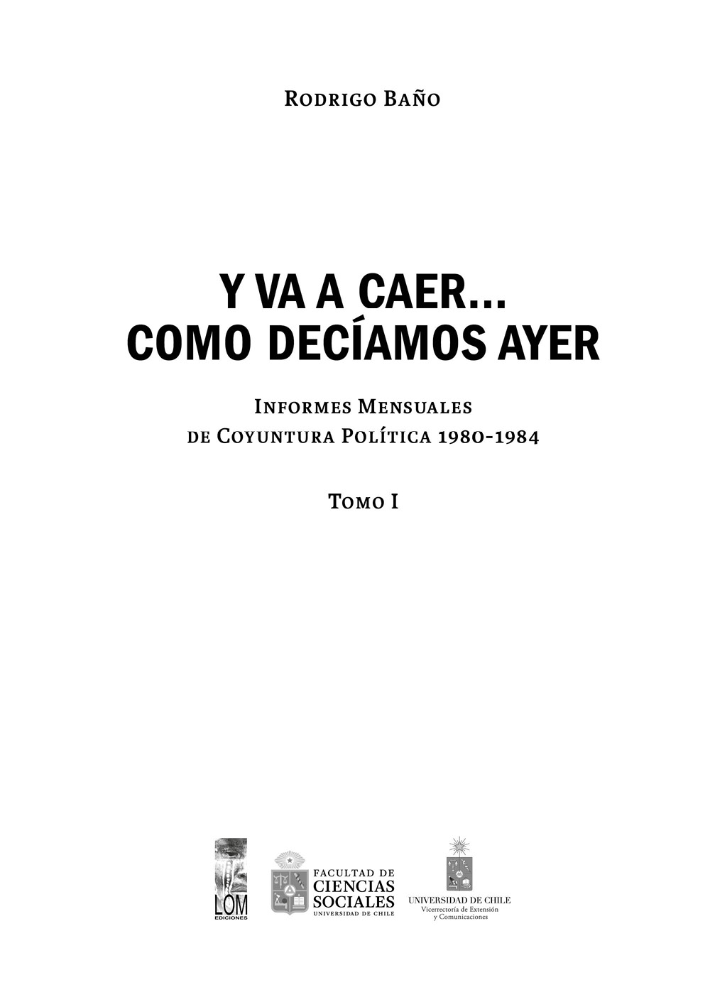 Debido a que el colosal trabajo mes a mes se transformaría también en un colosal mamotreto, la presente publicación de la colección completa del Informe Mensual de Coyuntura Política (sin agregar, quitar ni modificar ni siquiera los errores, que siempre son de imprenta) se ha dividido en dos volúmenes: el primero y el segundo, dedicados, respectivamenste, al subperíodo julio 1980- diciembre 1984 y al subperíodo enero 1985- diciembre 1989. Como suele suceder, la publicación tiene como principal sentido satisfacer la vanidad de quien aparece como autor. No obstante, también puede ser de interés para quien quiera comparar cómo se analizaba un período en el momento que ocurría y cómo se analiza después. En esta permanente querella de las verdades, no se trata de criticar el que todos seamos generales después de la batalla (si todos fuéramos generales durante la batalla sería un despelote), sino simplemente de entregar a la diversión de los presentes las ingenuidades del pasado.
