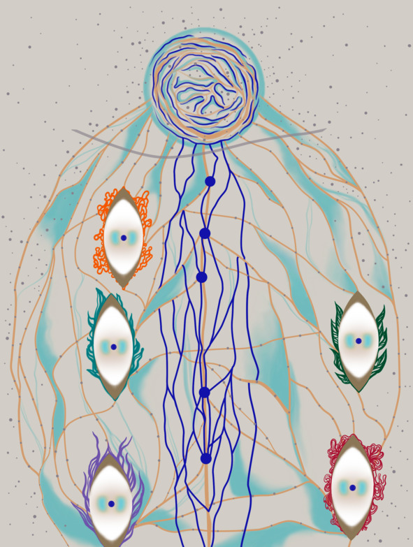 Синие каналы – это пуповина между каналами связи. Перекликающаяся пуповина. Их очень много. Центр – это как пуповина, что соединяет каналы связи, на которые крепится энергия. Или что это? Это не энергия. Это проявление. То есть капсула. Она проявляется через вспышку, и эта вспышка аккумулируется, и получается рождение, возникает проявление. Суть проявляется в одном из планов. Например, физическая жизнь.