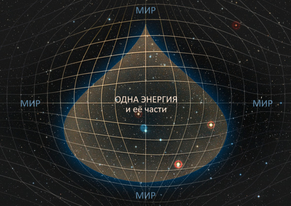 Я вижу, как множественность миров, в том числе это пространство, накладывается на наш мир, который возникает из одной точки. То есть нет отделенного одного от другого. Все в одной точке одновременно существует.