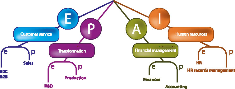 Для поддержания в численно растущей организации духа предпринимательства Адизес советует придерживаться бизнес-структуры, включающей четыре управленческие роли[78]: предпринимательскую (Е), производственную (Р), административную (А) и интегрирующую (I).