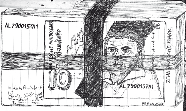 Пачка дойчмарок – воплощение любви студента к деньгам (рисунок автора 1993 г.)
