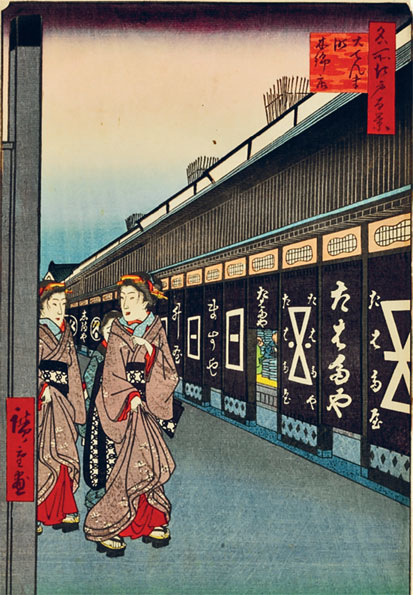 Утагава Хиросигэ. Улица мануфактурных магазинов в квартале Одэмматё. Один из ста видов из серии «100 знаменитых видов Эдо», созданных в 1856–1858 гг.