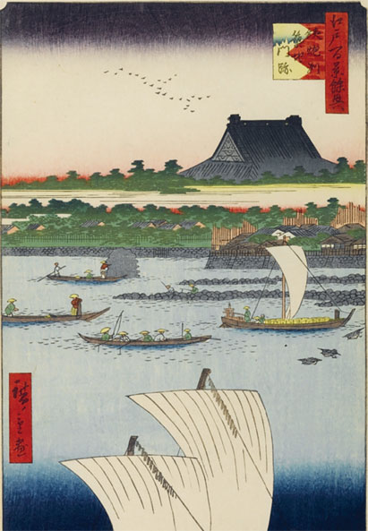 Утагава Хиросигэ. Монастырь Ниси-Хонгадзи в Цукидзимансэки на отмели Тэпподзу. Один из ста видов из серии «100 знаменитых видов Эдо», созданных в 1856–1858 гг.