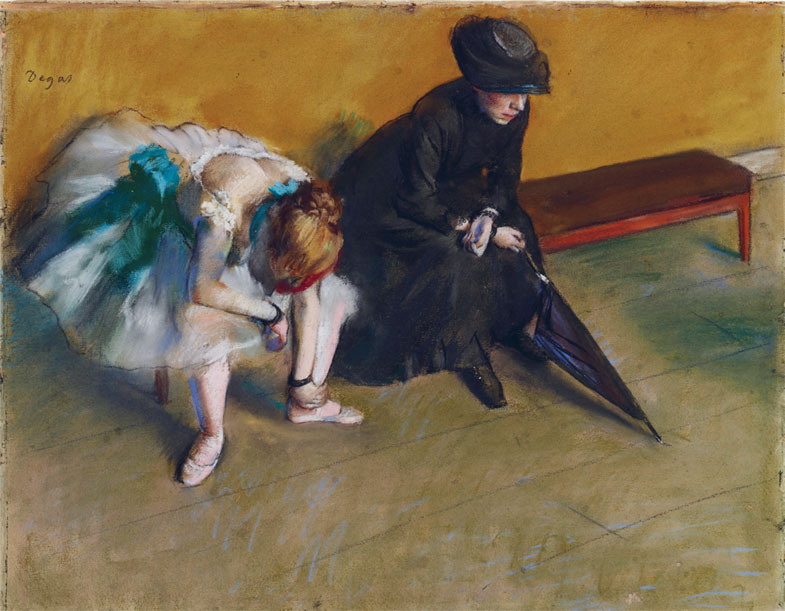В картине «Ожидание» уставшая танцовщица сидит на банкетке, поправляя пуант. Здесь нет привычных для движений балерины грации и изящества, её ноги расставлены широко, правой рукой она опирается о колено. Художник сместил акценты, и балерина, актриса, имеющая привычку восхищать танцем на сцене, превратилась в обычного человека в неуклюжей позе – уставшего так же, как дама в чёрном, сидящая рядом.