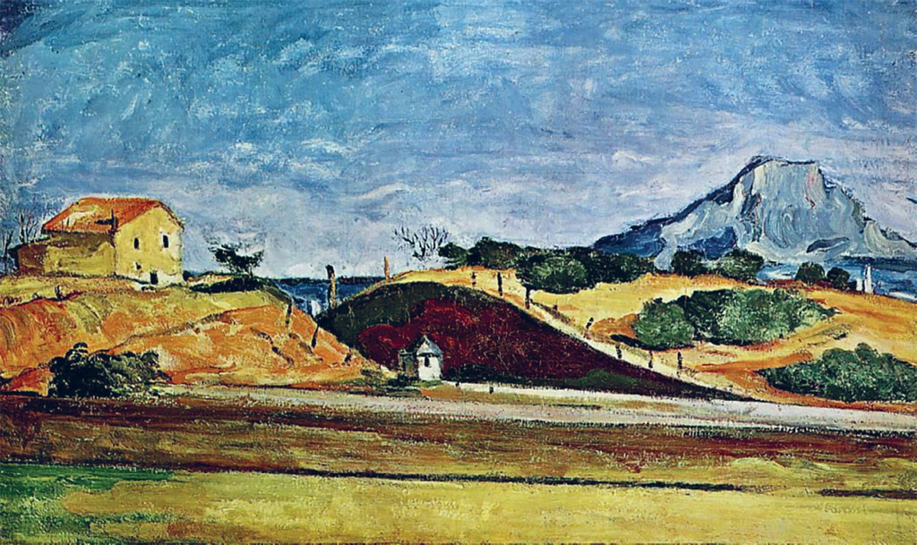 Начав свой путь в 1860-е годы с портретов и бытовых сцен, выполненных в тёмной гамме, Сезанн переехал в Париж. После знакомства с импрессионистами он полюбил пейзажи, наполнил свои полотна ярким, сочным цветом. Это было особенностью многих начинающих мастеров, приезжавших в Париж в конце XIX века, когда импрессионизм удивлял, поражал и увлекал за собой. Не избежал этого и Поль Сезанн. Однако лёгкость импрессионистических образов, стремление показать мир изменчивым не оказались близки Сезанну. Внимательный взгляд на природу, способность видеть цвет привели художника к постановке других целей в искусстве. Начиная с 1870-х годов многочисленные пейзажи Сезанна помогают эти цели раскрыть. В картине «Дорога с горой Сент-Виктуар» широкими и густыми мазками изображены холмы, кусты, дома и синеющая справа гора. Она явно доминирует в пейзаже и может восприниматься главным его героем. Подобная треугольнику форма горы рифмуется с треугольниками холмов, кустов справа и перевёрнутым треугольником синеющей за холмами дали. Хижина в центре композиции усиливает эту рифмовку, а дом с треугольной крышей слева делает её уравновешенной и спокойной.