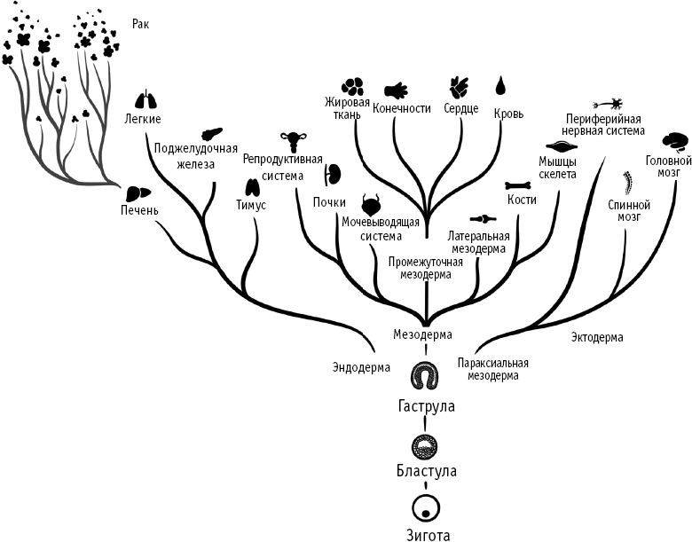 Рисунок 2.1. На рисунке изображено эволюционное дерево клеток нашего тела с момента зачатия до полного развития. Рак показан слева в виде «густой» ветки. Наш организм развивается из одной оплодотворенной яйцеклетки (зиготы), которая многократно делится, сначала образуя полый шарик из клеток (бластулу), который затем выворачивается в особую форму (гаструлу), где появляются разные типы клеток, из которых в итоге возникнут все клетки тела. Рак развивается из мутировавших клеток, которые размножаются слишком быстро, стремительно распространяясь по популяции соматических клеток, составляющих ткани, – здесь показано на примере рака печени, сформировавшегося из ее структуры