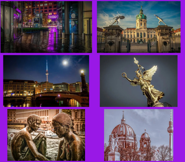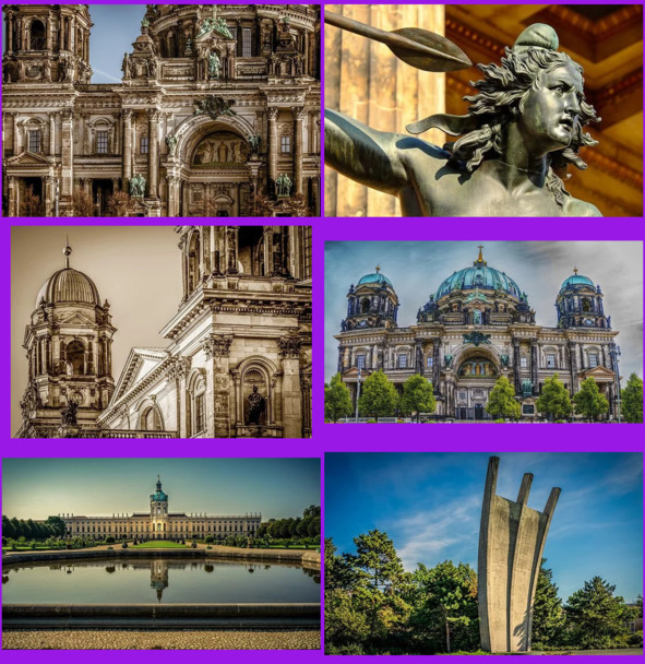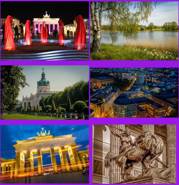 «Церковь святой Марии, Берлинский собор, Оперный театр, Бранденбургские ворота, Красная ратуша, Рейхстаг (перестроенный в 1999), Дворец Бельвю. На площади Брайтшайдплатц сохранены и законсервированы руины разрушенной в войну Церкви императора Вильгельма, как памятник-напоминание о войне».