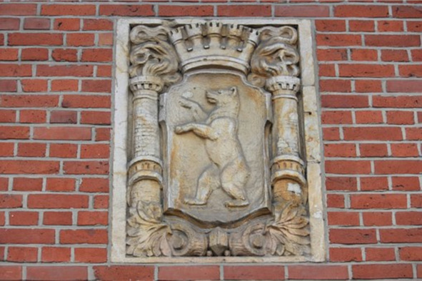 Ber- в начале слова Berlin звучит подобно немецкому слову Bär («медведь»), и как раз образ медведя красуется на городском гербе (как минимум с 1280-го г. медведь – символ Берлина). Таким образом, имеет место явная ассоциация с образом медведя.