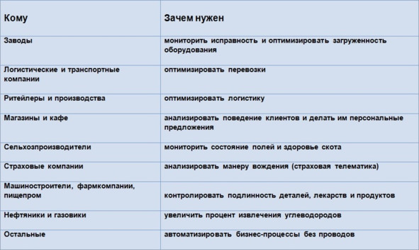 Опрошенными Rusbase экспертами приводится ряд практических сценариев использования Интернета вещей [1]: