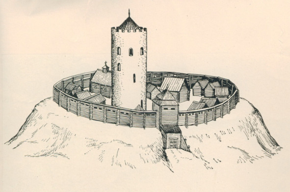 Древний Каменец. Реконструкция по материалам М.А.Ткачёва, рисунок Я.С.Кулика. Источник: https://kamenets.by/kamenetskaya-bashnya/