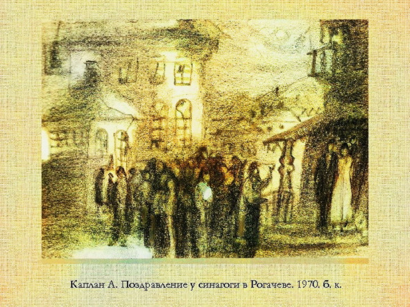 На встречу с нами пришло человек двадцать. Комната в одном из деревянных домов стала импровизированным зрительным залом. Давид Симанович много рассказывал о Шагале, читал стихи, посвященные художнику. Я сказал, что наши города дали миру двух больших еврейских Мастеров: Шагала и Каплана. И, увидев реакцию моих собеседников, понял, что если о Шагале они что-то слышали, то фамилия Каплан им ничего не говорит. Я спросил: „Может быть, в городе живут какие-то дальние родственники, или те, кто знал эту семью?“. Собравшиеся посмотрели на женщину, сидевшую у дверей. – Наша фамилия Каплан, – сказала она. – Но о том человеке, о котором вы спрашиваете, я ничего не слышала. Сегодня в разных странах мира выпускаются альбомы с репродукциями работ Анатолия Каплана, выставки проходят в крупнейших выставочных залах, а в Рогачеве – городе, который вдохновлял его творчество, ничего не слышали о Мастере. Здесь это по-прежнему забытое имя».