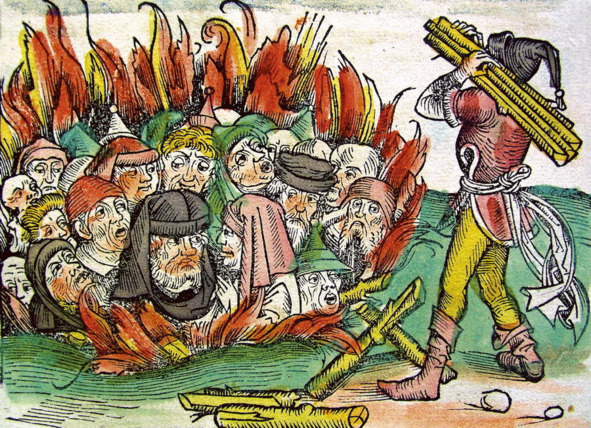 Сожжение евреев по обвинению в осквернении гостии. Раскрашенная ксилография. Нюрнбергская хроника. 1493. Источник: https://lechaim.ru/academy/strasti-evreev-pragi-pogrom-1389-goda-i-nbsp-uroki-srednevekovoj-parodii/