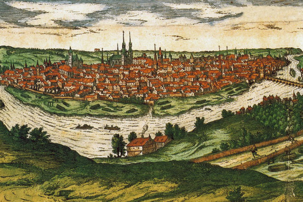 Прага. Фрагмент цветной гравюры. 1591. Национальный музей, Прага. Источник: https://lechaim.ru/academy/strasti-evreev-pragi-pogrom-1389-goda-i-nbsp-uroki-srednevekovoj-parodii/