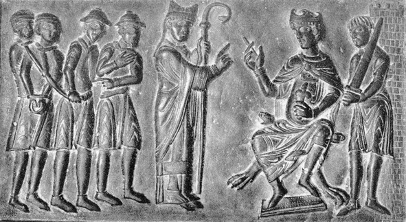 Адальберт Пражский обличает евреев, торгующих христианскими рабами, перед Болеславом II, герцогом Богемии. Рельеф с двери дворца в Гнезно (Польша). Источник: http://www.ejwiki.org/wiki/Файл:Gniezno_Boleslaus_II.jpg