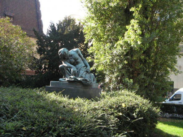 Cкульптура Моисея за синагогальным зданием. «Бронзовая скульптура Моисея (Socha Mojžíše) создана выдающимся чешским скульптором-символистом Франтишеком Билеком в 1905 году. Находится она в сквере рядом со Староновой синагогой на улице Парижской. Коленопреклоненный Моисей записывает в свиток имя Адам – символ человечества. Пророк берет на себя бремя ответственности за свой народ и ищет для него Землю Обетованную». Источник: https://pragagid.ru/skulptura-moisej-56