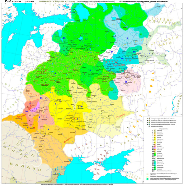 «Цветная карта Епархий Русской церкви в 14-ом веке, составленная по знаменитому Списку городов русских». Источник: https://awrus7.livejournal.com/tag/Список%20городов%20русских