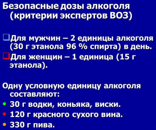 «оптимальная суточная доза спиртного для мужчин – 3—4 стандартные алкогольные единицы (АЕ), для женщин – 2—3 АЕ. Каждому человеку независимо от пола нельзя превышать суточную дозу в 5 АЕ. Рекомендуемый максимальный недельный лимит 21 АЕ для мужчин и 14 АЕ для женщин. Не потраченные единицы нельзя накапливать как бонусы и тратить все вместе, поскольку это будет превышением максимальной суточной нормы. Также очень важно воздерживаться от употребления алкоголя минимум 3 дня в неделю».