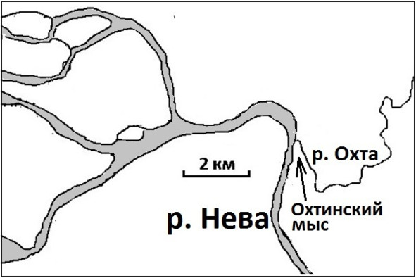 Охтинский мыс (место, где Охта впадает в Неву, см. рис. 14) – уникальное место не только для Санкт-Петербурга, но и вообще для России и для Северной Европы. На очень ограниченной территории были обнаружены археологические памятники, относящиеся к разным эпохам: шведская крепость Ниеншанц, которая существовала в 17 веке и была взята русскими в 1703 году, средневековое русское городище Невское устье, шведская крепость Ландскрона, построенная в 1300 году, а уже в 1301 взятая штурмом и разрушенная русскими, а также следы неолитического времени (территория мыса стала осваиваться людьми в IV – III тыс. до н. э.).