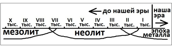 На территории Петербурга и шире, вообще, северо-запада России неолитический период начинается приблизительно в VII – VI тыс. до н.э. и завершается в начале II тыс. до н. (см. рис. 3).
