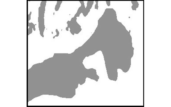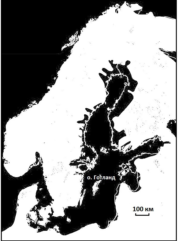 Рис. 7. Общая карта Литоринового моря, белые линии показывают современные берега (источник изображения – Littorina Sea)