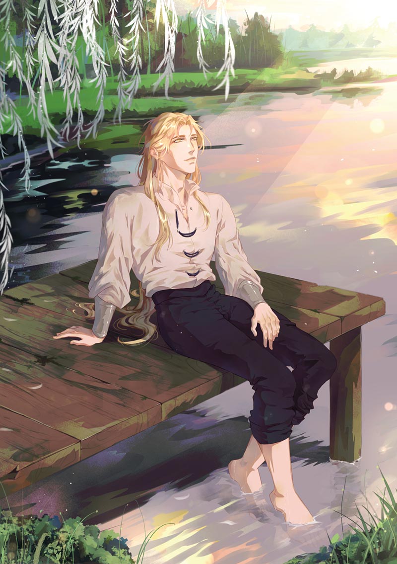 Люциан помахал Хаски на прощание и устроился на пирсе. Он снял сапоги, подвернул штаны до колена и опустил ноги в воду, принявшись наблюдать за разноцветными карпами. Закатные лучи солнца придавали его золотистым волосам бронзовый отлив, а светлой коже – легкий медовый оттенок. Длинные золотые ресницы скрывали его взгляд, а на губах играла нежная улыбка.