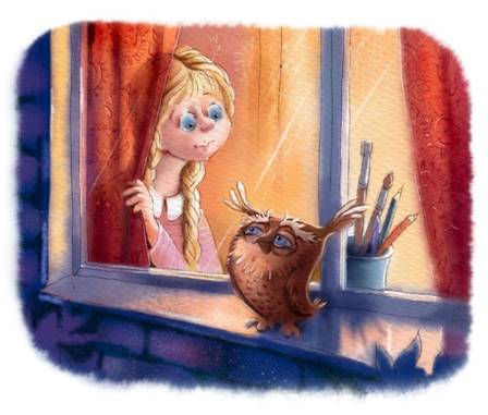 Но тут вдруг снова кто-то постучал. Вглядываясь повнимательнее, она заметила, что на подоконнике сидит какой-то взъерошенный комочек, похожий на птенца совы. Коричневое оперение делало его почти незаметным в вечерних сумерках. И лишь длинные, словно антенны, пёрышки на ушах, смешно подрагивали при каждом ударе клювом о стекло.