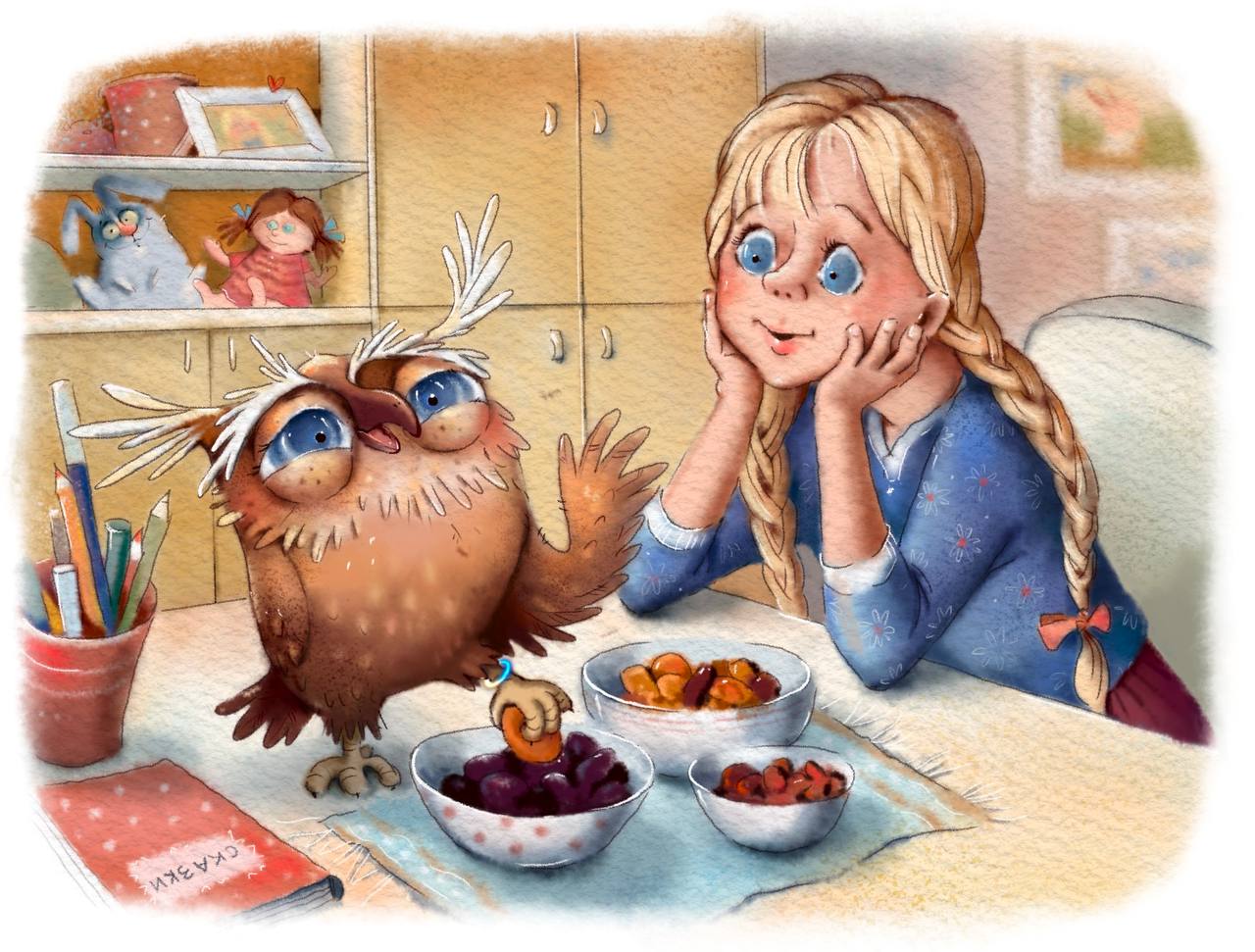 – Ну вот ещё. Стала бы я в такую даль лететь, если бы тут и поесть было нечего? – Сова постаралась принять обиженный вид, хотя подрагивающие перышки на ушах придавали её облику явно комическое выражение. – Семечки, орехи, изюм, фрукты, чернослив… Хоть что-нибудь из этого есть? Неси.