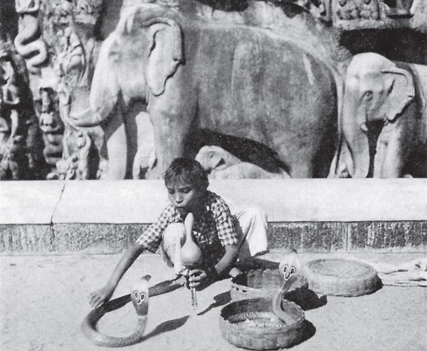 Илл. 4. Мальчик-заклинатель змей с коброй на улице Махабалипурама. Сзади изображение рельефа со слонами