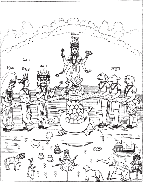 Илл. 8. Пахтанье океана (из книги Э. Мура «Hindu Pantheon»). Боги (слева) и демоны-асуры (справа) пахтали океан, чтобы добыть напиток бессмертия – амриту. Вместо веревки они взяли царя змей Васуки, а мутовкой сделали гору Мандару, использовав в качестве опоры для нее царя черепах, держащего мир на своей спине. По мере пахтания из океана появлялись месяц, богиня счастья Лакшми, чудесный белый конь, белый слон, волшебный камень, чудесное дерево и др. сокровища, и, наконец, сосуд с амритой