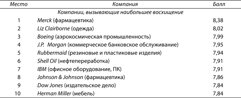 Американские компании, вызывающие наибольшее восхищениеЖурнал Fortune, составитель известного списка Fortune 500, включающего крупнейшие промышленные фирмы США, проводит также опросы с целью выявления корпораций США, вызывающих наибольшее восхищение делового сообщества. Так, в ходе одного такого исследования более 8200 руководителей, финансовых аналитиков и директоров других компаний попросили оценить 300 специально отобранных компаний из 33 отраслей по 8 основным характеристикам и по шкале от 0 (очень плохо) до 10 (отлично). Характеристики были таковы: качество менеджмента, качество товаров или услуг, новаторство, ценность долгосрочных инвестиций, финансовая стабильность, способность привлекать, удерживать и развивать талантливых работников, ответственность перед местным сообществом и окружающей средой и использование активов корпорации. Классификация, представленная Fortune, интересна с нескольких точек зрения. Во-первых, она позволяет понять, какие характеристики считаются критериями организационного успеха. Во-вторых, она показывает, как относятся опытные менеджеры и аналитики в области менеджмента, т. е. люди, посвятившие этой теме всю жизнь, к компаниям, работающим в их сфере. В-третьих, она демонстрирует огромное влияние перемен, ведь из десяти компаний, возглавлявших список в 1986 году, только IBM и Merck оставались в нем пять лет подряд. Однако IBM, которая во все предыдущие годы была на первом месте, в 1986 году переместилась на седьмое.