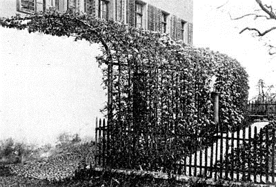 In a very similar manner apple, pear or plum trees may be trained so as to form an arched arbor way. In this kind of make-up they present a most agreeable novelty. An example of this kind of training is shown in the illustration, page 5. For this purpose cordon trees are usually best; though peach or apricot trees in U-form or double U-form will answer very well. Even apple trees or pears formed as palmettes-Verrier can be carried up over an arched trellis.