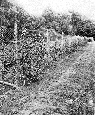 There are many places where the owner of a city or suburban lot can secure the fun and the substantial benefits belonging to the fruit grower on land that would be otherwise wasted, if he will only build a woven wire fence on the property line between him and his not-too-agreeable neighbor, using this fence as a support for a row of cordon plums, pears or apples. If he has time and inclination to do a little more work with the trees he can better plant U-form peaches, nectarines or apricots, or he can grow plums in U-form, or he can have fan-form cherry trees, or apples or pears in Verrier-palmettes. One of the most interesting and productive lots in the author's dwarf fruit garden is a row of plum trees on such a woven wire trellis. The trees in this row stand two feet apart, and form a perfect screen. (Fig. 6.) The majority of the trees which were necessarily taken for planting this row were not propagated on suitable stocks, and many varieties were introduced for experimental purposes which were obviously unadapted to this mode of training, but nevertheless the net result has been highly satisfactory.