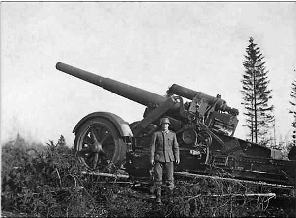 21-см мортира. На участке XXVI армейского корпуса противник заранее подготовил все возможное для действий масс артиллерии. Эти мортиры (или гаубицы) были одним из самых смертоносных орудий немецкой артиллерии (из коллекции Дениса Жукова)
