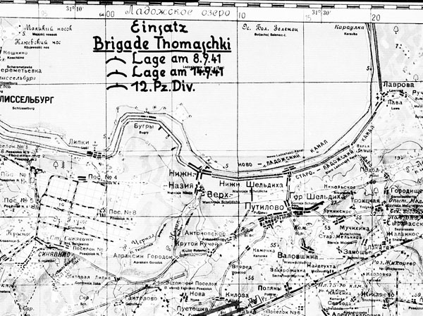 Южнее, на стыке 39-го моторизованного корпуса и 1-го армейского корпуса, находилась так называемая Бригада Томашки, названная так по имени командира 123-го Артиллерийского командования. С 4 сентября ее подчинили штабу 39-го моторизованного корпуса, а затем некоторое время бригада действовала, подчиняясь штабу 12-й танковой дивизии. Она обеспечивала оборону участка южнее Мги и вдоль р. Чёрная.