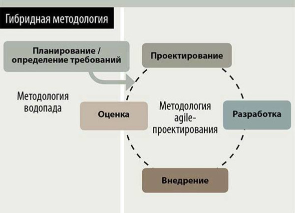 Несмотря на то что многие команды отдают предпочтение либо методологии водопада, либо agile-проектированию, преимущества обоих подходов привели к появлению гибридной методологии, когда этапы планирования и определения требований выполняются согласно методологии водопада, а этапы проектирования, разработки, внедрения и оценки соответствуют гибкому подходу. Данная методология является попыткой применения сильных сторон каждого из основных подходов, а также снижения негативного воздействия слабых сторон. Гибридная методология может хорошо вписаться в сферу информационных технологий за счет того, что на уровне руководства организации проект имеет четко поставленные цели, хорошо документированы, предоставляет возможность мониторинга статуса проекта для предоставления руководству. На этапе выполнения за счет высокого уровня коммуникации между представителями бизнеса и непосредственно исполнителями задачи по проекту глубоко детализированы, понятны разработчикам. Возможность учится «на лету», совершать ошибки и совершенствовать продукт под текущие требования бизнеса одинаково хорошо для разработчиков и бизнеса. Конечно за все надо платить. Подход предъявляет требования к как к техническому уровню подготовки сотрудников, так и к его персональным качествам.