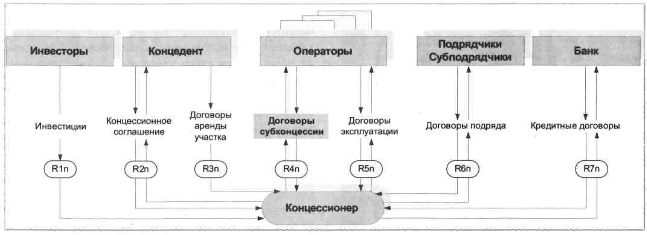 В России концессионные формы управления государственной собственностью имеют небольшое распространение. Для их развития необходимы: совершенствование законодательной базы; опыт и экономическая проработка социально-политических, экономических, хозяйственных отношений, в первую очередь между государством и инвесторами. В этом плане научно обоснованная политика в сфере идентификации, распределения и ограничения рисков является одним из важнейших условий успешной реализации проекта и ключевым фактором, влияющим на показатели его экономической, бюджетной и финансовой эффективности, доходности кредитного рейтинга проекта. Рассмотрим особенности определения рисков на стадиях проектирования, финансирования, строительства (реконструкции) и эксплуатации дорог на концессионной основе. Для всей системы концессионных отношений между участниками проекта характерны индивидуальные риски Rn (см. рис.).