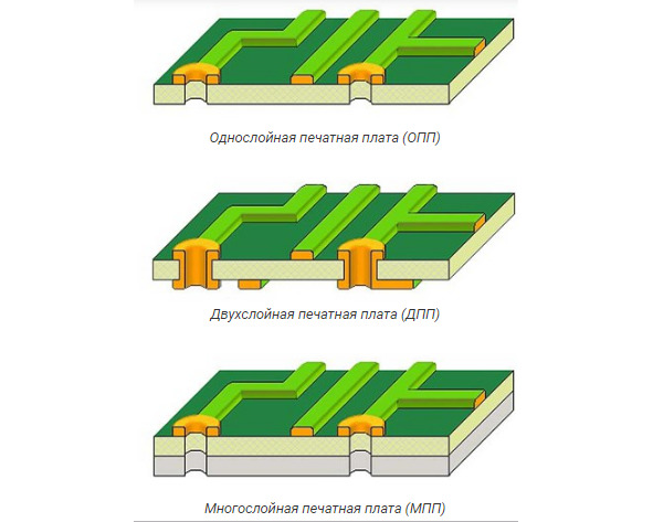 Для начала, небольшое «лирическое отступление». Многим известно, что печатные платы бывают: односторонними (лист медной фольги располагается на пластине из текстолита), двухсторонними (два листа медной фольги, между которыми располагается пластина из текстолита), многослойные (медная фольга располагается не только на двух сторонах платы, но и во внутренних слоях диэлектрика). см. Рис 1.