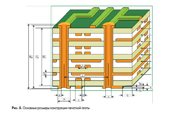 Пример многослойной печатной платы с размеченными на ней параметрами. Рис 3.