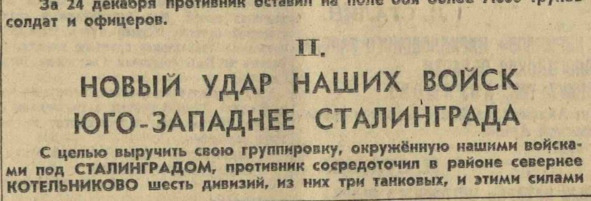 Напомним, что кроме официальных сводок в газетах очевидно печатались и эксклюзивные материалы военных корреспондентов с различных участков Сталинградской Битвы. И как вы уже догадались, до конца декабря, ни в одной подобной статье слово «окружение» или «котел» произнесено не было. То есть у редакторов СМИ была четкая установка сверху – эти термины не использовать.