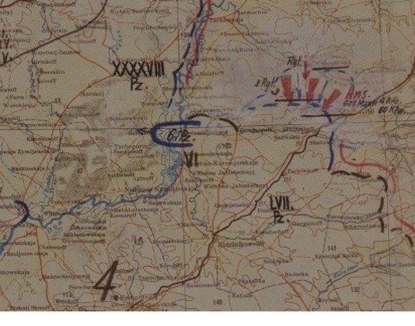На немецкой карте от 24 числа хорошо видно, как скукожился, отступив от Мышковы, LVII танковый корпус. 6-я танковая дивизия Рауса (Erhard Raus) вообще уже находится за Доном, спеша парировать удар «Малого Сатурна».