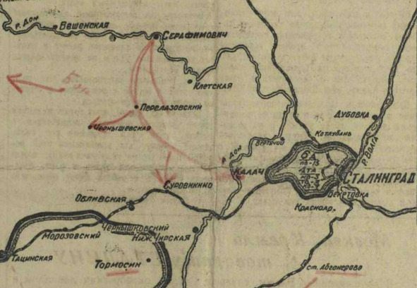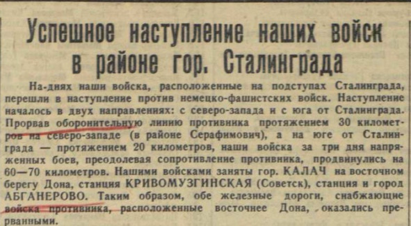 24 ноября 1942 года во всех советских СМИ опубликовали первые данные о нашем наступлении, которые, казалось бы, полностью вписываются в общеизвестный контекст – взяли г. Калач и прервали обе железные дороги на Сталинград. Нюанс в том, что в этом сообщении нет даже намека на окружение и соединение наших фронтов в районе поселка Советский!