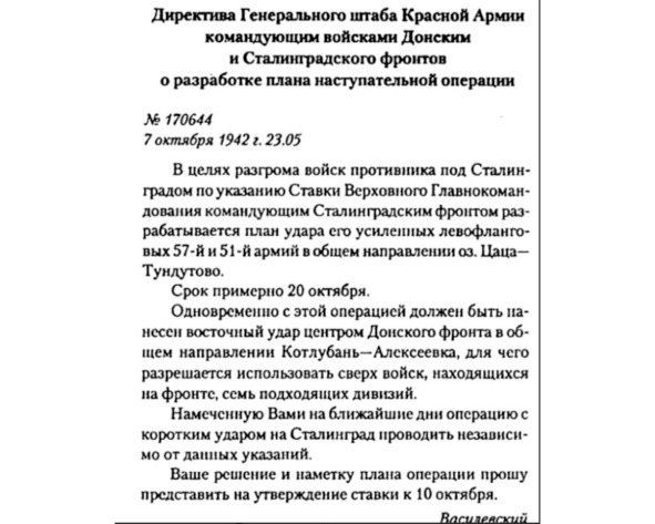 Наилучшим направлением удара в Донского Фронта является направление с Клетской, Сиротинской на Калач… Нанесение же удара восточнее Дона из района Котлубань ни к какому успеху не приведет.. В этой операции должны решающую роль сыграть 3 гв. кк и две три мех бригады, которые за сутки должны выйти к Калачу и взорвать все переправы вплоть от Вертячего, встав фронтом на восток… Операцию нужно начать 20—22 октября [21]