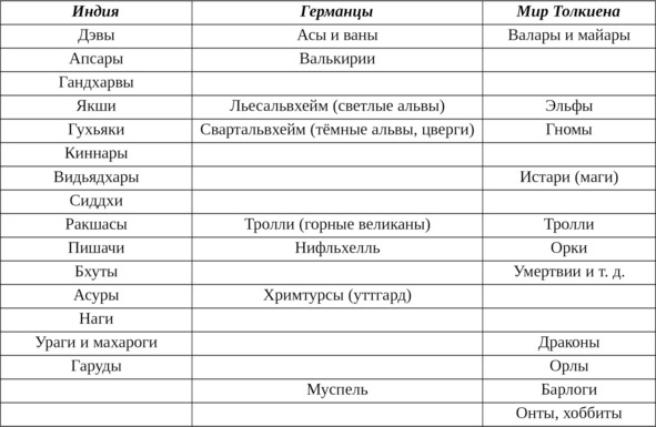 Отметим, что и в индийской и в толкиеновской мифологии мы имеем внутреннюю бинарную структуру, в которой типологически близкие существа составляют пары антагонистов по принципу «благой – проклятый» (как ангелы – демоны):